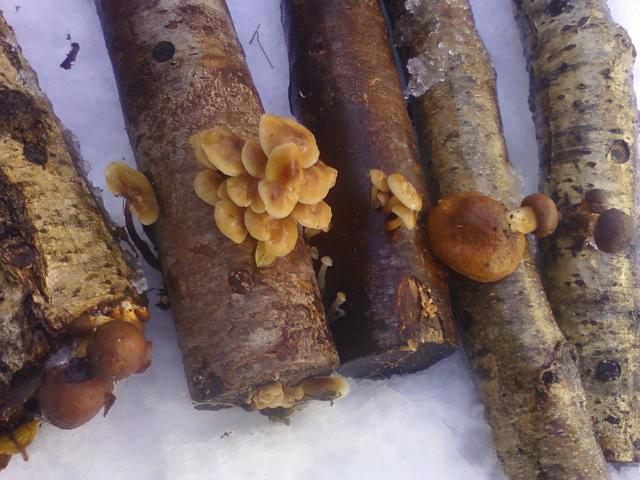 種菌を打ち込んでない未使用の原木や伐根から天然のエノキタケが昨年に続きまた出て来ました、どこからか飛んで来た胞子が付いて条件がそろったのでしょう。