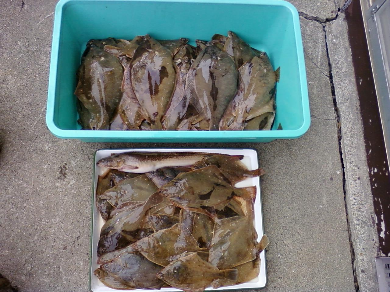 情報通り浅瀬でも宗八カレイの入れ食いとなり、大型サイズをゲット。クーラーBOXが満杯にならないうちにマガレイのポイントに移動。産卵間近のマガレイを予定通り釣り上げ、釣果もまずまず。