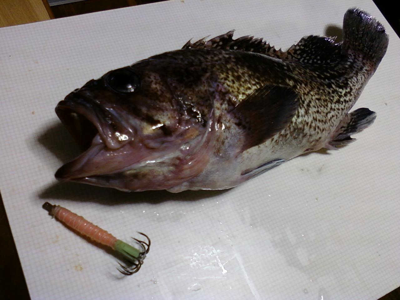 ヤリイカ、豆イカ狙いのモガ針に30センチクラスのマゾイがヒット。釣り上げるのにひと苦労。かろうじてゲットし、刺身でいただきました。