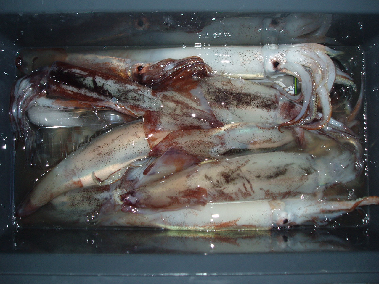 1)釣ったイカのスミを吐かせたあと海中にぶら下げておいたかごに入れ、生かしておく。