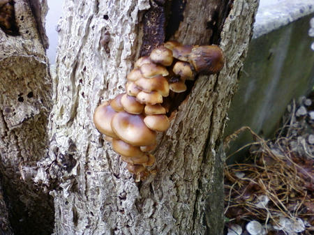 今年3月に種駒を打ち込んだ原木より、ナメコが木口や接地面脇より11月末から少々芽吹き始めましたが気温が低いのか成長が遅い様で、1年目なので来年に期待する事に。