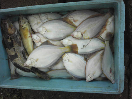 今日の釣果、45センチアブラコを筆頭に35センチ前後マガレイ35枚、イシガレイ35センチ3枚程でした。