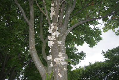 自宅近くの立ち枯れたナナカマドに、天然のウスヒラタケが密生していました。